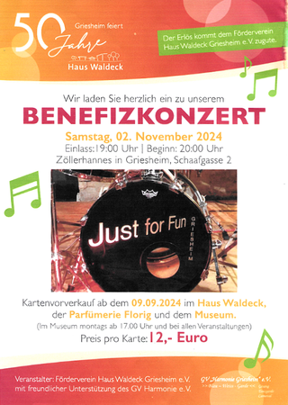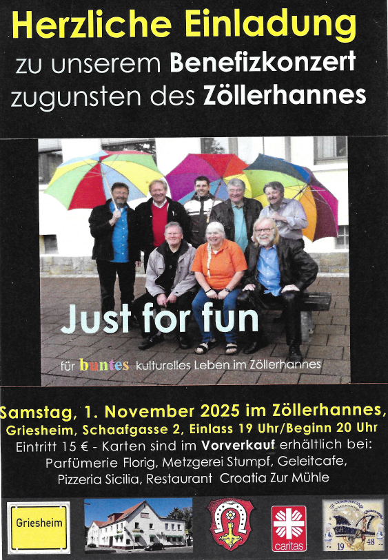 Bandleader von Just for Fun und Griesheims Ehrenbürgermeister Norbert Leber teilt uns in einer Mitteilung mit, dass die Band nun auch ihr Traditionskonzert im Jagdhofkeller (27.11.) absagen müssen.